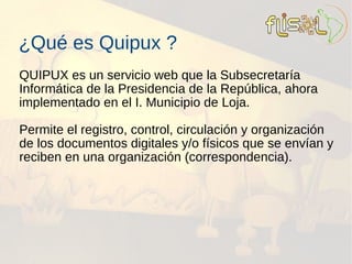 El documento describe el sistema de gestión documental Quipux que ha sido implementado en el Municipio de Loja. Quipux permite el registro, control y organización de documentos digitales y físicos que se envían y reciben entre las unidades y direcciones municipales. Actualmente, los documentos se envían y reciben de forma física, lo que causa problemas como traspapelado, demoras y dependencia del mensajero. Al implementar Quipux, los documentos se digitalizan y envían electrónicamente, lo que trae beneficios como acceso web, firma digital, a