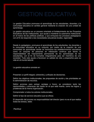 La gestión educativa promueve el aprendizaje de estudiantes, docentes y la comunidad mediante la creación de una unidad de aprendizaje. Implica fortalecer proyectos educativos institucionales, mantener autonomía dentro de políticas públicas y enriquecer procesos pedagógicos para responder a necesidades locales y regionales. El director debe planificar, controlar, definir objetivos y tomar decisiones para resolver problemas, además de comunicarse y capacitar al personal.