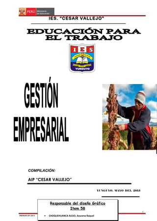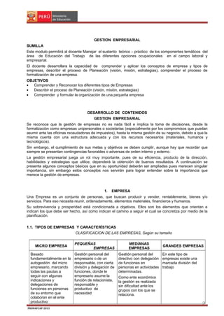 Este documento presenta información sobre la gestión empresarial. Explica los diferentes tipos de empresas según su tamaño, tecnología, gestión y organización. Define empresa y describe los procesos de planificación, organización, dirección y control que son fundamentales para la gestión de una empresa. Finalmente, detalla los conceptos de visión, misión y objetivos que son la base para establecer metas y estrategias empresariales.