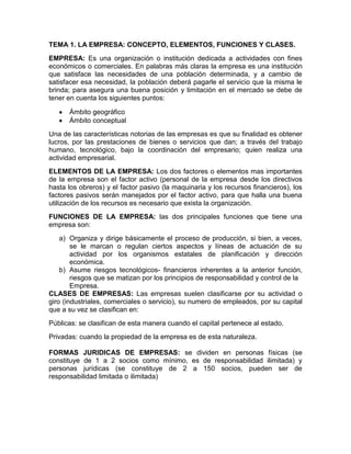 Este documento define la empresa como una organización dedicada a actividades económicas o comerciales para satisfacer las necesidades de una población a cambio de pago. Explica que una empresa tiene dos elementos clave: el factor activo (personal) y el factor pasivo (recursos). Sus funciones principales son organizar el proceso de producción y asumir riesgos tecnológicos y financieros. Finalmente, clasifica las empresas por su actividad, tamaño, capital (públicas o privadas) y forma jurídica (personas físicas o jurídic