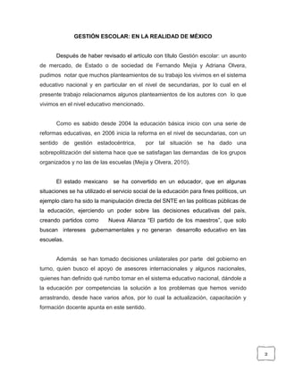 Este documento analiza los diferentes modelos de gestión escolar (estadocéntrica, mercadocéntrica y policéntrica) en el contexto de México. Señala que la gestión en México se ha caracterizado históricamente por ser estadocéntrica, con decisiones unilaterales por parte del gobierno y manipulación por parte de sindicatos magisteriales. También ha habido elementos mercadocéntricos como la educación por competencias, aunque de manera limitada. Finalmente, señala que una gestión policéntrica no es factible dado