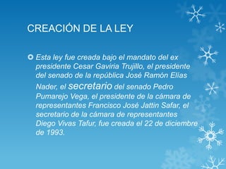 La Ley 99 de 1993 estableció el Sistema Nacional Ambiental de Colombia y creó el Ministerio del Medio Ambiente. La ley define principios como el desarrollo sostenible y establece objetivos y funciones para el Ministerio y otras entidades ambientales. Además, la ley trata temas como licencias ambientales, tasas retributivas, funciones de policía ambiental, y el marco legal para la protección de recursos naturales.