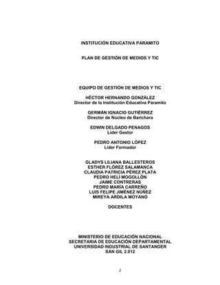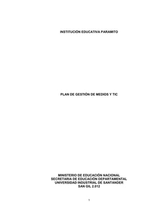 El resumen analiza el diagnóstico institucional de la Institución Educativa Paramito sobre el uso de medios y TIC. Se identifican fortalezas como la sensibilización de directivos y docentes sobre la importancia de las TIC, pero también debilidades como la ausencia de un plan sistematizado para la implementación de las TIC en procesos institucionales. Asimismo, se mencionan oportunidades como acceder a portales educativos y amenazas como las interferencias en la conectividad.