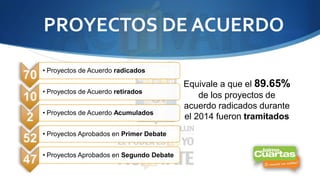 El informe resume los proyectos y actividades realizadas por el Concejo de Medellín durante 2014, incluyendo la tramitación de proyectos de acuerdo, debates de control político, sesiones ordinarias y extraordinarias, eventos de participación ciudadana como foros y cabildos abiertos sobre el Plan de Ordenamiento Territorial, y el uso de redes sociales para ampliar el alcance de la institución. Adicionalmente, destaca logros como el cumplimiento de metas, capacitaciones a concejales, y mejoras en infraestructura y sistemas