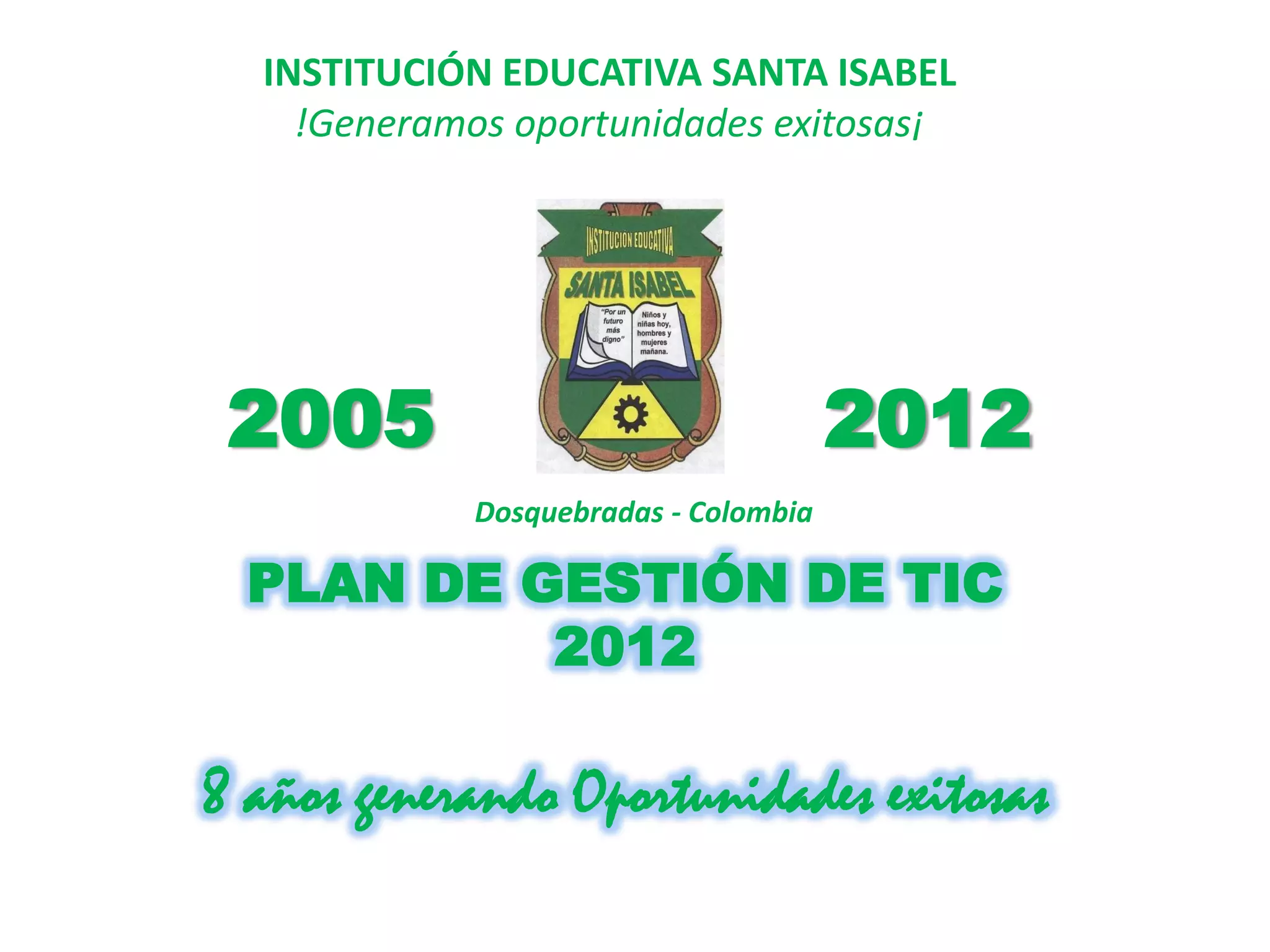 El documento es un plan de gestión de TIC de la institución educativa Santa Isabel en Dosquebrada, Colombia, que abarca el periodo de 2005 a 2012. Identifica dificultades en la gestión, como la falta de recursos y el desinterés del personal, y establece metas para articular las TIC en los procesos educativos y administrativos. Se proponen estrategias para mejorar la calidad educativa mediante la capacitación continua y la dotación de equipos tecnológicos.
