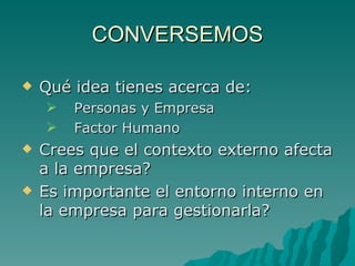 El documento describe los tres entornos que afectan la gestión del potencial humano en una empresa: el entorno externo, el entorno interno y el entorno del individuo. Explica que para gestionar el potencial humano se debe tener en cuenta estos tres entornos y aplicar un enfoque de sistemas que vea a la gestión del talento humano como parte de un todo interrelacionado. También presenta los principales procesos y funciones involucrados en la gestión del talento humano dentro de la empresa.