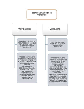 Este documento resume los conceptos clave de factibilidad y viabilidad para la gestión y evaluación de proyectos. Explica que la factibilidad estudia los recursos disponibles para un proyecto, incluyendo la factibilidad técnica, económica y operacional. Además, define la viabilidad como el estudio que determina el éxito o fracaso de un proyecto, considerando la viabilidad técnica y económica en términos de recursos y ganancias.