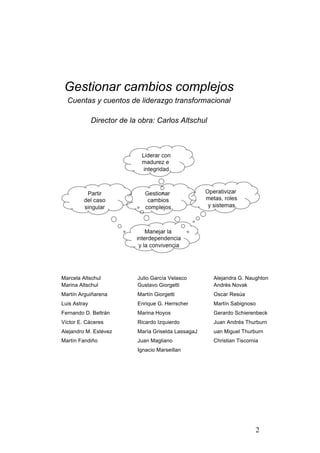 Este documento describe tres tipos de situaciones complejas de cambio y el enfoque para gestionarlas. Primero, ante problemas mayores se debe apelar a la intuición, buscar soluciones de compromiso y crear instancias fundacionales. Luego, se necesita construir una coalición de voluntades mediante el pacto con los interesados. Finalmente, se debe concentrar en cuestiones concretas, reconociendo que no todo puede resolverse y avanzando mediante instrumentos de gestión. El documento también analiza las condiciones para lograr cambios significativos en ent