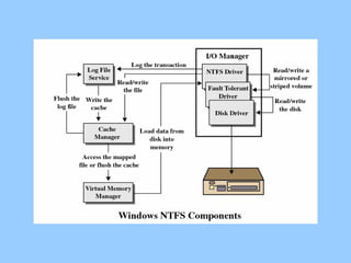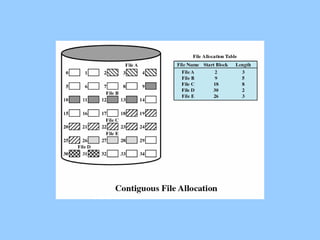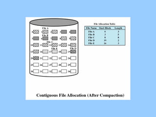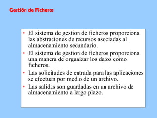 El documento describe los conceptos fundamentales de los sistemas de gestión de archivos, incluyendo la organización de archivos, directorios, asignación de espacio en disco, y técnicas para gestionar el espacio libre como tablas de bits y cadenas de secciones libres. El sistema de gestión de archivos proporciona abstracciones para organizar y almacenar datos de forma estructurada en archivos y directorios, y gestionar el acceso a los mismos.