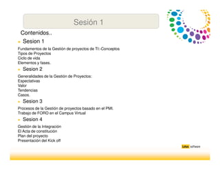 El documento presenta una introducción a la gestión de proyectos. Cubre conceptos como tipos de proyectos (proyectos, subproyectos, programas y portafolios), ciclo de vida de proyectos y sus fases (inicio, planificación, ejecución, supervisión y control, cierre). También describe los conocimientos y procesos clave de gestión de proyectos según el PMI como la integración, alcance, tiempo, costos, calidad, recursos humanos, comunicaciones, riesgos y adquisiciones. El documento