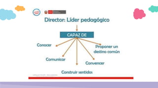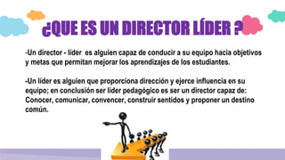 El documento describe las características y competencias de un director líder pedagógico. Un director líder es alguien que puede guiar a su equipo hacia metas que mejoren el aprendizaje de los estudiantes. Según docentes peruanos, un director debe tener competencias organizacionales, estudios pedagógicos, experiencia e inteligencia emocional. Un director líder debe ser un ejemplo, motivar a otros, y tener la capacidad de mejorar el clima y la comunicación en la institución educativa.