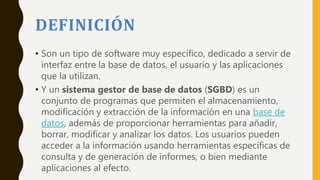 Este documento describe los componentes y tipos de sistemas gestores de bases de datos. Explica que un sistema gestor de bases de datos es un conjunto de programas que permiten almacenar, modificar y extraer información de una base de datos. Luego describe los principales componentes de un sistema gestor de bases de datos y varios modelos de bases de datos como el relacional, jerárquico y orientado a objetos. Finalmente, menciona algunos sistemas gestores de bases de datos populares como MySQL, Microsoft SQL Server y PostgreSQL.