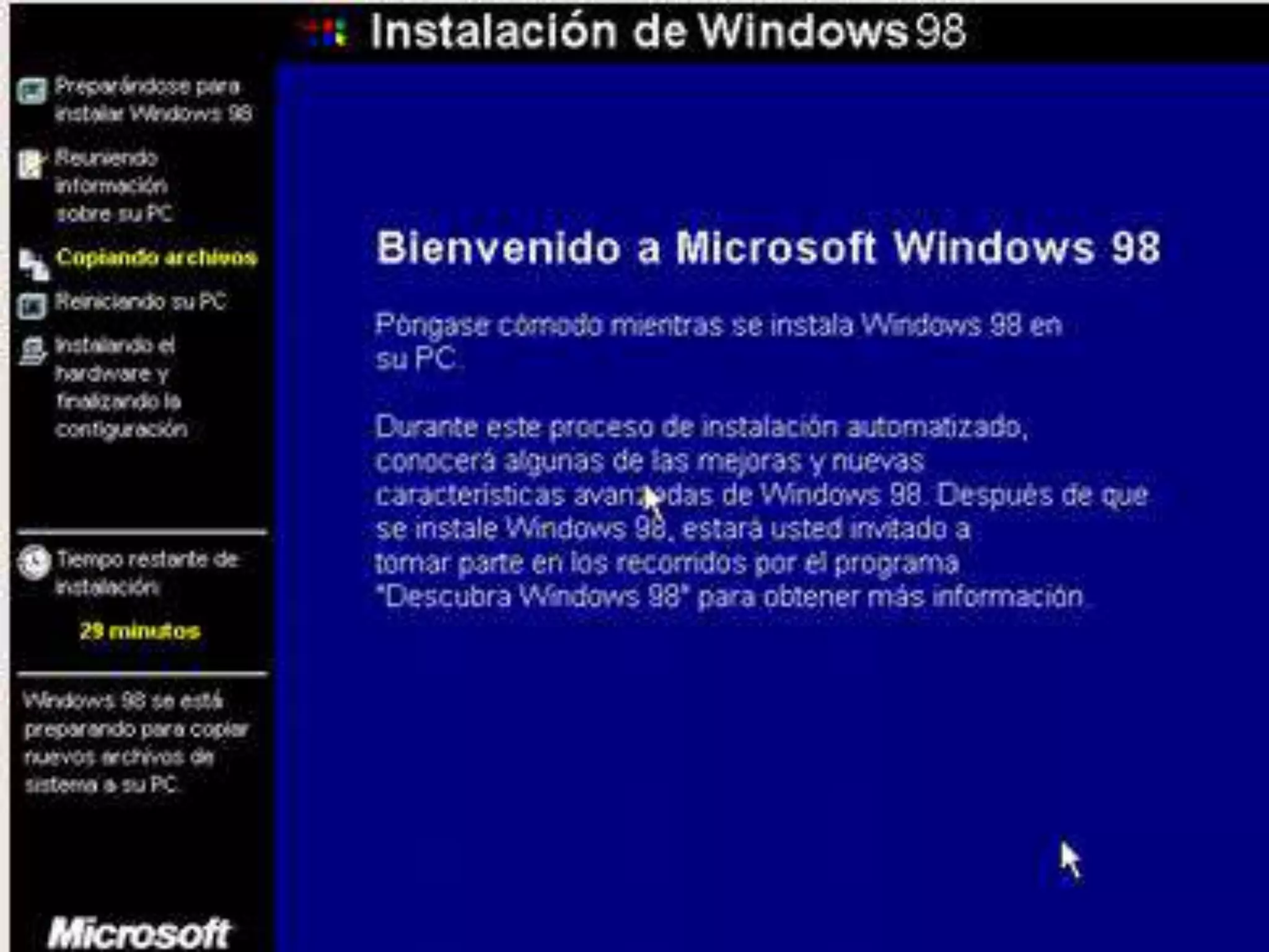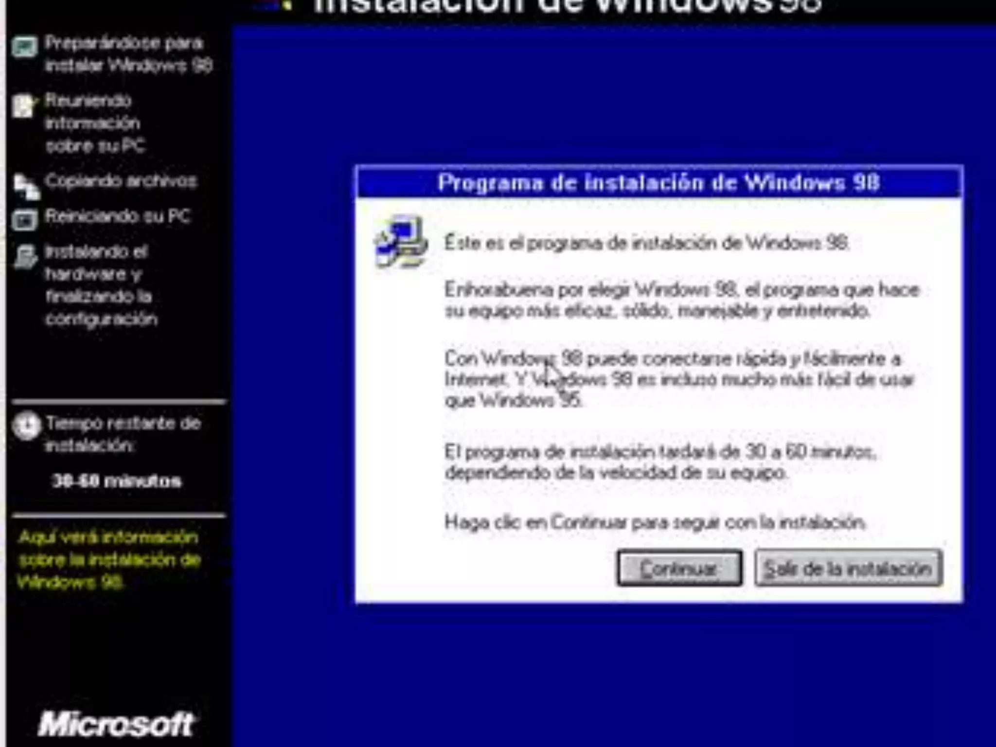 El documento describe los pasos para instalar Windows 98 SE, incluyendo configurar el arranque, preparar la instalación e instalar el sistema operativo.