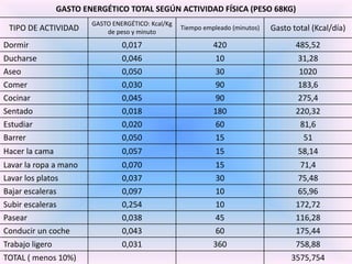 Este documento calcula el gasto energético total diario (GETD) de Carmen García Colomo de 68 kg basado en sus actividades diarias como dormir, aseo personal, comer, cocinar, estudiar, limpieza del hogar y trabajo ligero. Su GETD total es de 3.575,754 Kcal/día, pero después de descontar un 10% por ser mujer queda en 3.218,2 Kcal/día, lo que supera en 1.143,2 kcal las necesidades energéticas recomendadas para una mujer de su edad a pesar de tener un