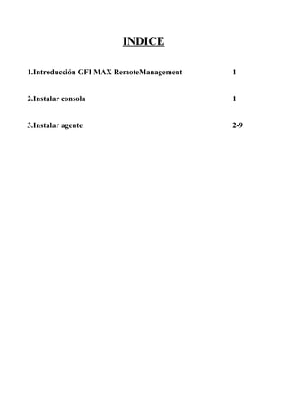 Este documento describe cómo instalar y configurar GFI MAX RemoteManagement. Explica que es un software de monitorización y administración remota que permite vigilar servidores, hardware y software a través de un agente. Detalla los pasos para descargar e instalar la consola de administración y el agente en los servidores y estaciones de trabajo, y cómo configurar las comprobaciones de estado y parámetros de monitorización en la consola y en cada agente.