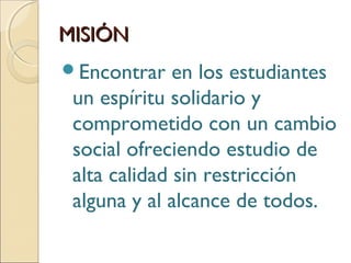 El documento presenta la misión, visión y reglamento estudiantil de una universidad. Su misión es ofrecer educación de alta calidad accesible a todos y fomentar un espíritu de cambio social entre los estudiantes. Su visión incluye promover valores religiosos y aumentar la competencia académica para contribuir al desarrollo del país. El reglamento requiere que los estudiantes cumplan las normas y se comprometan con problemas nacionales, y describe los cargos y funciones en la universidad.