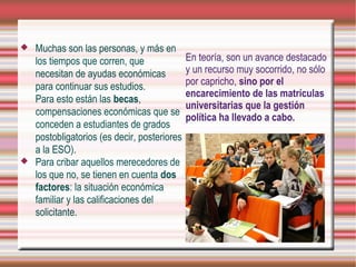 El documento describe los problemas con las becas de Wert en España, incluyendo retrasos en la aprobación y entrega de las becas, lo que ha forzado a algunos estudiantes a abandonar sus estudios. También describe cómo algunos estudiantes recibieron cartas indicando que su beca era de 0€ debido a la falta de fondos, y cómo los recortes han afectado a las becas Erasmus.