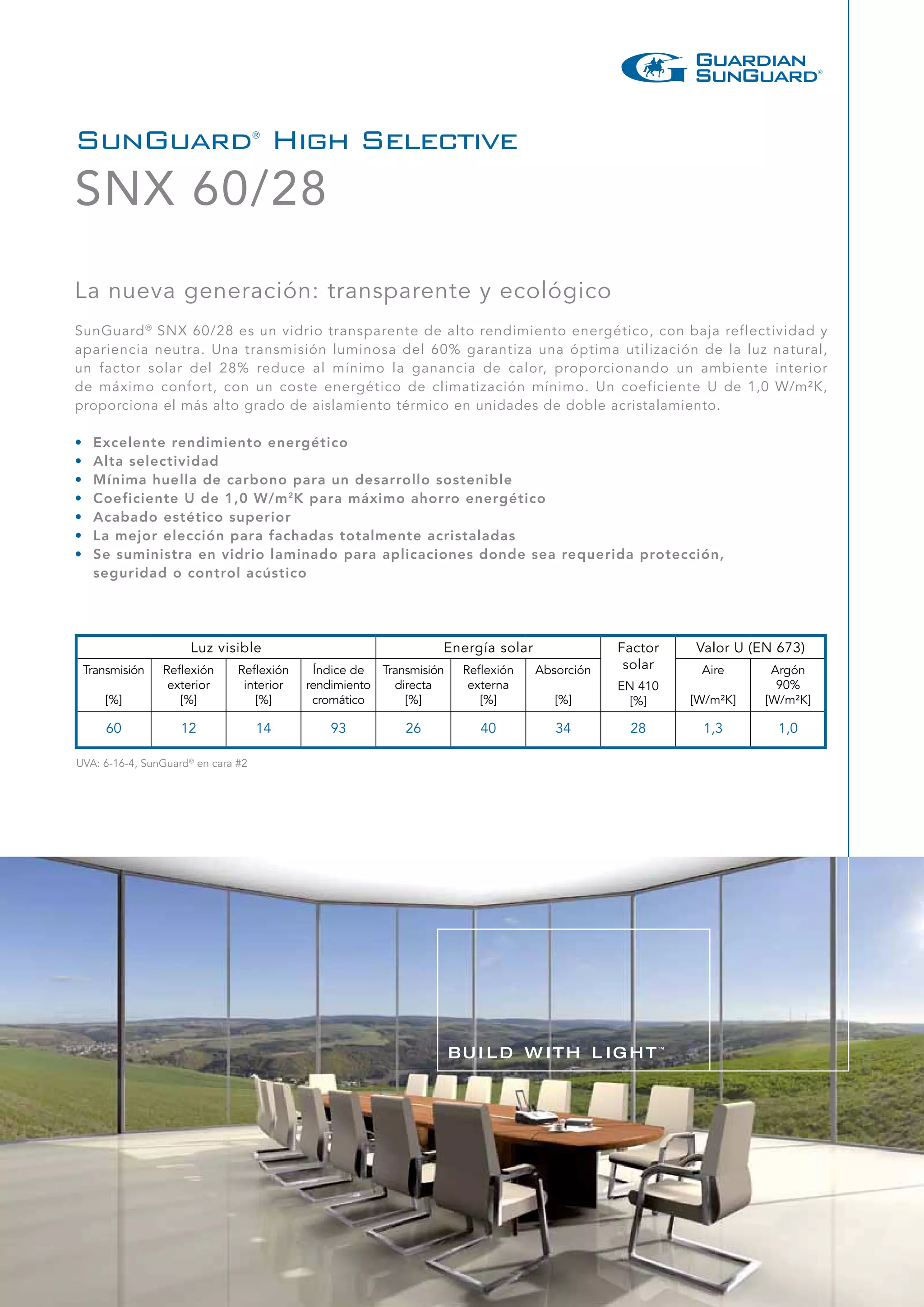 El documento describe el vidrio SunGuard SNX 60/28, un vidrio de alto rendimiento energético con baja reflectividad y apariencia neutra. Tiene una transmisión luminosa del 60% y un factor solar del 28%, proporcionando confort interior con bajos costes de climatización. Su coeficiente U de 1,0 W/m2K proporciona un alto aislamiento térmico. El vidrio tiene un excelente rendimiento energético y baja huella de carbono para un desarrollo sostenible.