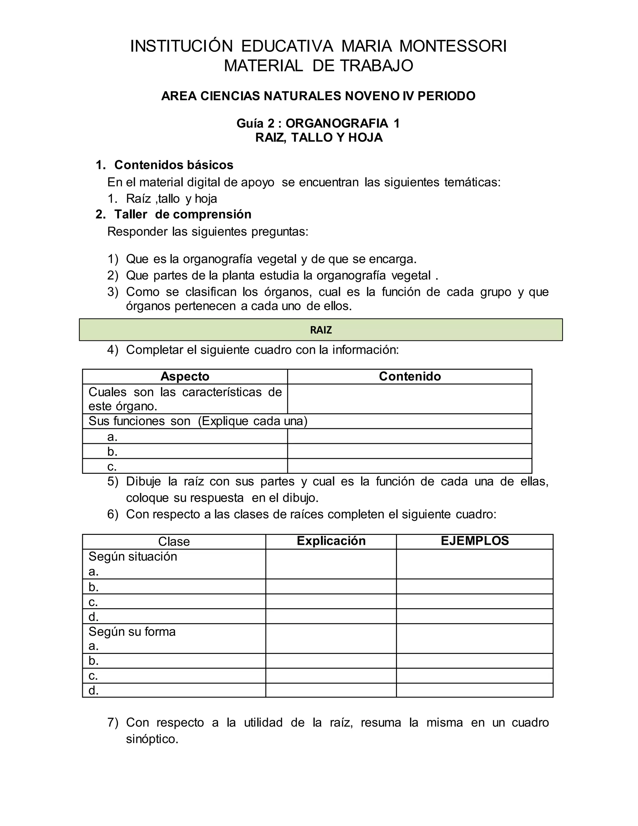Este documento presenta una guía sobre la organografía vegetal para el noveno grado. Explica que la organografía estudia las partes de la planta como la raíz, tallo y hoja. Proporciona instrucciones para completar actividades sobre la estructura, funciones y clasificaciones de cada órgano. También incluye sugerencias para realizar trabajos extracurriculares como la recolección y clasificación de raíces, tallos y hojas para un herbario grupal.