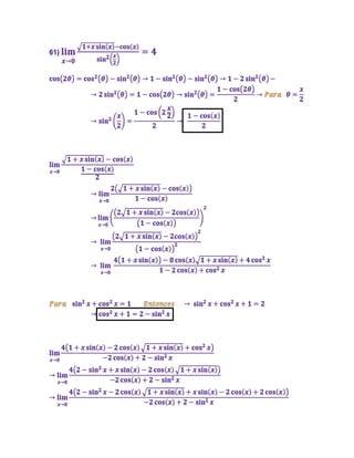 El documento presenta varios ejemplos de factorización de fracciones algebraicas. En cada caso, se muestra el procedimiento paso a paso para factorizar el numerador y denominador, y luego evaluar el límite de la fracción resultante cuando x tiende a un valor particular.