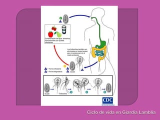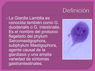 La Giardia lamblia es un protozoo flagelado que causa la enfermedad giardiasis y síntomas gastrointestinales. Existen dos formas de G. lamblia: el trofozoíto, que es la forma móvil que infecta el tracto digestivo, y el quiste, que es la forma de resistencia que se elimina en las heces. La infección se produce cuando se ingieren quistes a través del agua o los alimentos contaminados y causa diarrea, dolor abdominal y pérdida de peso.