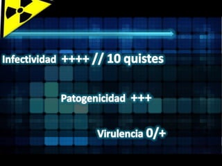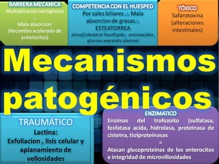 Este documento describe la giardiasis, una enfermedad causada por el parásito Giardia lamblia. Explica que se transmite a través del agua o alimentos contaminados, o contacto directo con heces infectadas. Los síntomas incluyen diarrea aguda o crónica, dolor abdominal, flatulencia, náuseas y vómitos. El diagnóstico se realiza a través de pruebas de laboratorio e historial clínico. El tratamiento con medicamentos como metronidazol u otros antibióticos es efectivo en el 90-