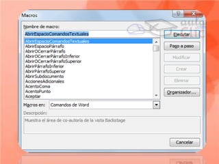 Este documento proporciona instrucciones sobre cómo utilizar Microsoft Word 2010. Explica cómo iniciar Word 2010, insertar y eliminar texto, seleccionar texto, crear nuevos documentos, abrir documentos existentes, guardar documentos, imprimir documentos, crear y formatear tablas, crear macros, insertar encabezados, pies de página e hipervínculos, configurar opciones de autocorrección y dividir texto en varias columnas.
