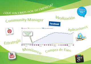 Este documento describe una estrategia de marketing en redes sociales que incluye el desarrollo de perfiles y contenidos en plataformas como Facebook, Twitter, YouTube y Pinterest para generar comunidad, atraer público objetivo y lograr los objetivos de la marca de manera genuina. La estrategia también involucra la medición de resultados y el monitoreo continuo en todas las redes sociales.