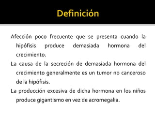 El gigantismo se produce cuando la glándula pituitaria secreta demasiada hormona del crecimiento durante la infancia, lo que causa un crecimiento excesivo. La causa más común es un tumor benigno en la pituitaria. Los síntomas incluyen un rápido crecimiento, retraso en la pubertad y problemas óseos y musculares. El diagnóstico se realiza mediante exámenes de sangre y de imagen para detectar tumores, y el tratamiento puede incluir cirugía o medicamentos.