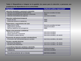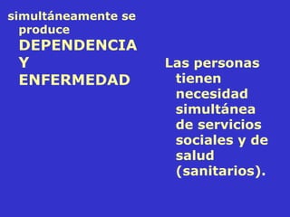 El documento discute la necesidad de coordinar los servicios sociales y sanitarios para atender a personas que requieren ambos tipos de servicios de manera simultánea debido a la dependencia y enfermedad. Propone que se centre la atención en las necesidades de la persona y se coordine la provisión de cuidados entre los diferentes servicios e instituciones involucradas.