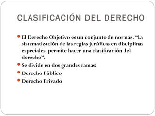 El documento clasifica el derecho en dos grandes ramas: derecho público y derecho privado. El derecho público se divide en derecho público interno, que regula la organización del Estado, y derecho público externo, que regula las relaciones entre Estados. El derecho privado se compone principalmente del derecho civil y mercantil.