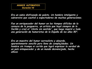 Miguel Gila fue un humorista español que cautivó a varias generaciones con su humor surrealista y absurdo. Dejó los estudios a los 13 años y trabajó en varios oficios manuales. Durante la Guerra Civil se alistó como voluntario y luego fue prisionero hasta 1939. Empezó como humorista gráfico y encontró el éxito en 1951 con monólogos de comedia. Vivió exiliado en Argentina en 1968 y realizó giras por Latinoamérica y España, hasta que regresó definitivamente en 1985. Falleció en 2001 debido