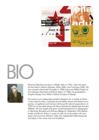 Fabrizio Gilardino es un diseñador gráfico italiano radicado en Montreal que cofundó la fundición tipográfica 2Rebels. En 2001 fundó el colectivo Socialist Designers para promover un diseño gráfico comprometido social y políticamente a través de un manifiesto con seis reglas como diseñar sin efectos, en una ubicación real y sin género. Explica que todo diseño es una afirmación política y rechaza la noción de que el diseño no está relacionado con la política.