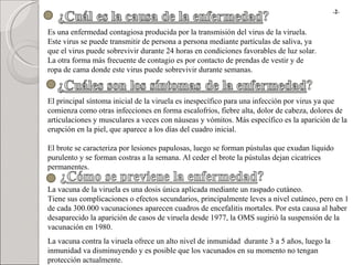 La viruela era una enfermedad contagiosa causada por el virus de la viruela, que podía transmitirse de persona a persona a través de la saliva o el contacto con la ropa. Los síntomas incluían fiebre, dolores musculares y una erupción en la piel con pústulas que dejaban cicatrices. La viruela fue erradicada mundialmente en 1980 gracias a campañas de vacunación.