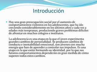 Este documento discute la violencia entre adolescentes y los factores que la influyen. Explica que la adolescencia es una etapa de grandes cambios emocionales y de formación de la identidad. Los adolescentes violentos no siguen las normas y son impulsivos. La violencia familiar y el maltrato influyen en la conducta violenta. También influye la sociedad a través de actitudes hacia la violencia y roles de género. La violencia en la escuela afecta negativamente a las víctimas, agresores y testigos. Se concluye que