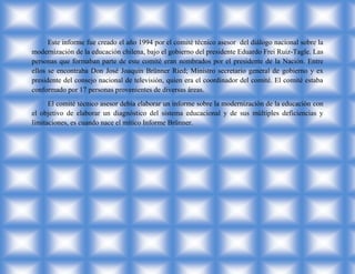 El documento presenta un resumen del Informe Brünner elaborado en 1994 por un comité técnico asesor para modernizar la educación chilena. El informe diagnosticó varios problemas del sistema educativo como una escolaridad corta, un curriculum rígido y anacrónico, enseñanza centrada en el profesor, baja calidad e infraestructura. Recomendó extender la escolaridad obligatoria, flexibilizar el curriculum, centrarse en el aprendizaje del alumno y mejorar las condiciones de los profesores. Desde entonces se