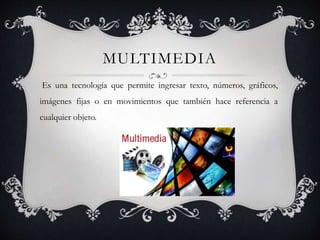 Este documento presenta conceptos clave de la tecnología multimedia e hipermedia. Define multimedia como una tecnología que permite incorporar diferentes tipos de medios como texto, números, gráficos e imágenes. Explica que la multimedia interactiva se basa en el diálogo entre usuarios y contenidos para captar su atención. Finalmente, introduce el hipertexto como un sistema de organización de datos basado en vínculos entre fragmentos, y la hipermedia como una forma avanzada de multimedia interactiva que aumenta el control del usuario sobre la información.