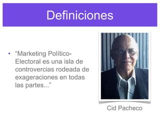 Este documento define el marketing político-electoral y discute sus principios fundamentales. Explica que es una técnica con posibilidades reales pero también con limitaciones. Señala que implica tener el candidato adecuado con la oferta correcta en el momento oportuno para asegurar que los votantes tengan conocimiento. También identifica fuerzas como la indiferencia, dilación y lo efímero que trabajan en contra durante una campaña y enfatiza la importancia de llegar al corazón de los votantes a través del contacto directo.