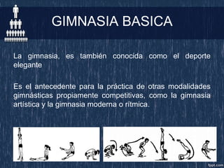 La gimnasia es conocida como el deporte elegante y es el antecedente de otras modalidades gimnásticas competitivas como la gimnasia artística y rítmica. El documento describe varios ejercicios básicos de gimnasia como la parada de manos, el rodamiento hacia adelante y hacia atrás, el aspa de molino y la vertical invertida. También habla sobre técnicas de respiración y explica brevemente la media mortal y mortal.