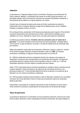 La gimnasia es un deporte que combina arte y movimiento, desarrollado desde la antigua Grecia para la preparación de guerreros, y se ha evolucionado a lo largo de los siglos hasta convertirse en un deporte olímpico. Existen diversas modalidades de gimnasia, como la rítmica, artística, acrobática y aeróbica, cada una con sus propios requerimientos y técnicas. Además de mejorar la salud y la condición física, la gimnasia fomenta habilidades como la confianza, el trabajo en equipo y la concentración.