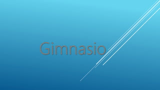 El documento define un gimnasio como un espacio creado para realizar actividad física. Los gimnasios modernos son privados y requieren membresía. Acudir al gimnasio diariamente ayuda a lograr los objetivos de ejercicio recomendados y trae beneficios físicos y mentales. Se recomienda comer nueces, yogur, huevos hervidos, semillas de chía o avena antes del ejercicio, y proteínas, cereales, carnes, lácteos después para recuperarse.