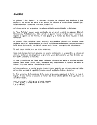 El documento describe un gimnasio llamado "Línea Perfecta" que ofrece varios programas de ejercicios y disciplinas como aeróbicos, gimnasia y salsa a través de tarjetas de socio. Los socios se registran en uno o más programas y deben someterse a controles mensuales de medidas y rutinas de ejercicios. El gimnasio actualiza los horarios en un pizarrón y lleva un control de asistencia de los socios.