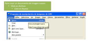 Este documento explica cómo crear una nueva imagen en GIMP. El usuario hace clic en Archivo y Nuevo para abrir una ventana donde puede configurar las propiedades de la imagen como el tamaño, resolución, espacio de color y color de fondo. Al hacer clic en Aceptar se crea la nueva imagen con esas especificaciones. Luego describe los elementos principales de la interfaz de GIMP como las barras de menús, herramientas y cómo seleccionar colores.