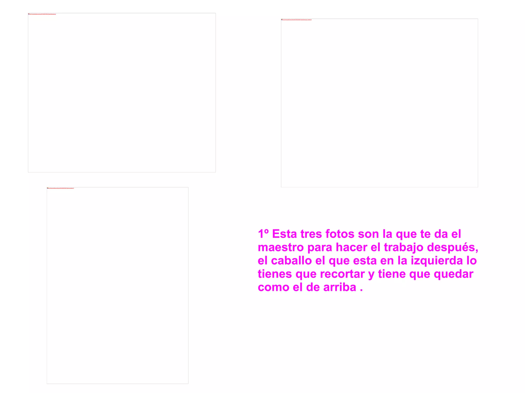 Este documento proporciona instrucciones para editar tres fotos utilizando un programa de edición de imágenes. Se instruye al lector a recortar un caballo de una foto para que coincida con otro, eliminar un burro de un paisaje para dejar solo el fondo, y borrar partes de un dibujo. Finalmente, muestra la imagen final con solo el burro y el paisaje.
