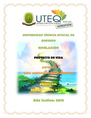 Este documento presenta el proyecto de vida de Gina Aurora Aviles Zambrano, una estudiante de 24 años de la Universidad Técnica Estatal de Quevedo. Su objetivo principal es terminar sus estudios universitarios en economía y establecer su propia empresa para crear fuentes de trabajo. Describe sus fortalezas, debilidades, oportunidades y amenazas, así como su visión, misión y quién es y quiere ser. Concluye recalcando la importancia de no darse por vencido y luchar por los objetivos a pesar de los obst