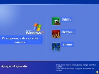 Este documento es una conversación entre un usuario y su computadora en asturiano. La computadora ofrece varias opciones de cosas que el usuario puede hacer, como enviar correos electrónicos, jugar juegos, buscar en Google, descargar películas y más. Sin embargo, la computadora parece tener problemas y se bloquea varias veces, frustrando al usuario.