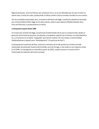 El CERN ha confirmado la detección de una partícula consistente con el bosón de Higgs, llamado la "partícula de Dios", que es fundamental para explicar el origen del universo y su estructura. La detección de esta partícula valida el Modelo Estándar de la física de partículas y sugiere que las partículas adquirieron masa a través de su interacción con el campo de Higgs después del Big Bang. La búsqueda de esta partícula se ha estado llevando a cabo desde 1980 en el CERN y otros laborator