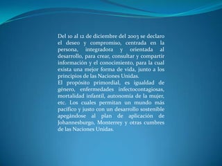 Este documento resume los principales puntos de un tratado sobre la sociedad de la información. Se destaca el compromiso de crear e intercambiar conocimiento e información de forma integradora y orientada al desarrollo, respetando los derechos humanos y la soberanía de los estados. También se enfatiza la importancia de promover el acceso universal a las tecnologías de la información y la comunicación para beneficiar a todos los grupos, y se compromete a evaluar los progresos hacia la reducción de la brecha digital de forma equitativa.