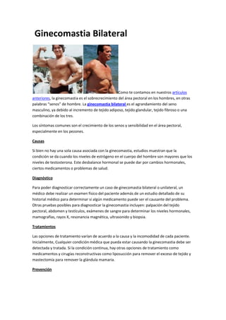 La ginecomastia bilateral es el crecimiento anormal de los senos en ambos lados del pecho en hombres, causado por un desequilibrio hormonal donde los niveles de estrógeno son mayores que los de testosterona. Se diagnostica mediante exámenes físicos, análisis de sangre y pruebas de imagen para determinar los niveles hormonales y la composición del tejido mamario. Los tratamientos incluyen terapias para la causa subyacente, medicamentos y cirugías como liposucción o mastectomía para