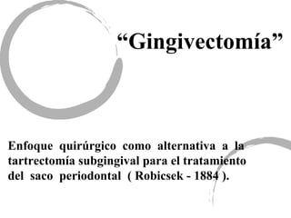 La gingivectomía es un procedimiento quirúrgico para eliminar el tejido gingival alrededor de los dientes. Involucra realizar incisiones en la encía para eliminar el exceso de tejido y reducir la profundidad de las bolsas periodontales, mejorando el acceso para la limpieza subgingival. La técnica incluye anestesiar el área, hacer incisiones primarias y secundarias, extraer el tejido cortado y pulir las raíces. Se usa para tratar agrandamientos gingiv